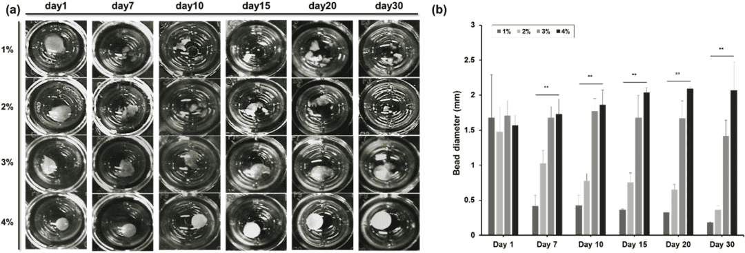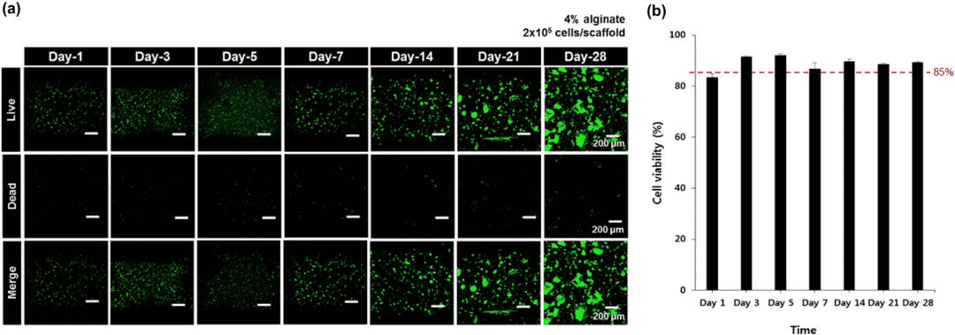 本研究論文聚焦生物3D打印胰島對I型糖尿病的治療研究。I型糖尿病是由朗格漢斯胰島β細胞缺失引起的胰島素缺乏導致的。在嚴重的情況下,一般會將胰島移植到門靜脈中。然而,由于移植胰島的喪失和胰島功能的衰竭,這些患者的5年胰島素獨立率小于50%。在這項研究中,我們開發(fā)了一種長期促進胰島素分泌的3D生物打印結構,植入皮下以防止胰島丟失。采用β細胞(小鼠胰島素瘤-6:MIN-6)包封海藻酸鹽生物墨水和聚己內酯生物降解聚合物的多層生物打印結構。葡萄糖反應測定顯示,該結構在4周的體外培養(yǎng)期間可以正常增殖和釋放胰島素。