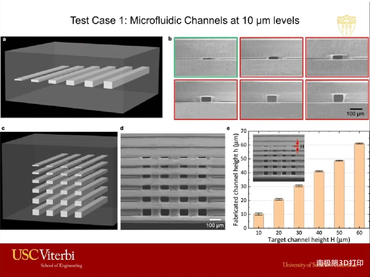 Chen說:"在光投射之后,我們基本上可以決定在哪里構建(芯片的)部件,由于我們使用的是光投影技術,所以在一個層內的分辨率可以相當高。然而,層與層之間的分辨率要差得多,這是構建微尺度通道的一個關鍵挑戰。這是我們第一次能夠打印出通道高度為10微米水平的結構,而且做到了真正的精準控制,誤差為±1微米。這是以前從未做過的事情,所以這是微通道3D打印的一個突破"。