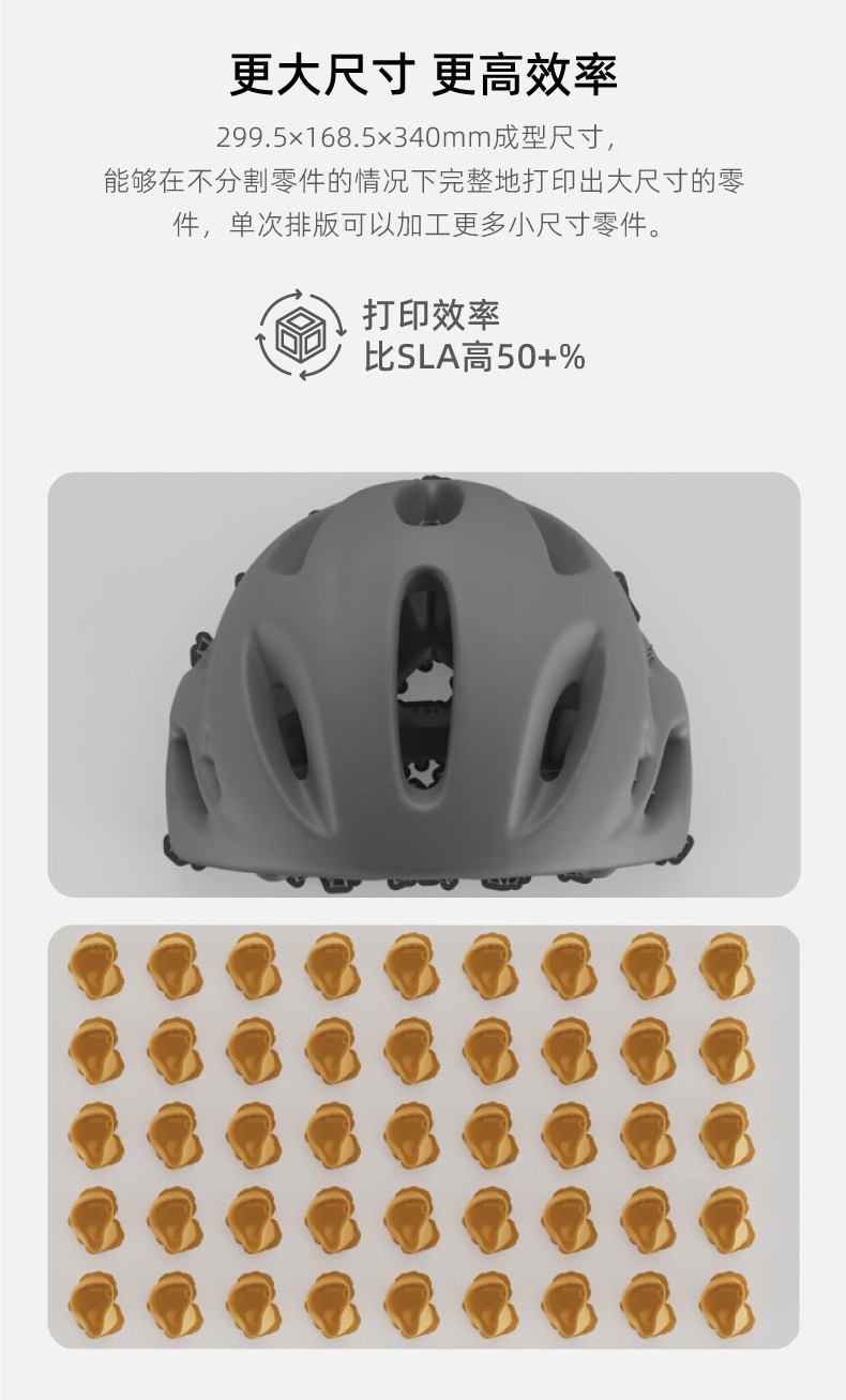 shape 4K的成型尺寸為299.5x168.5x340mm,能夠在不分害零件的情況下完整地打印出大尺寸的零件,您也可以利用shape 4K的幅面優勢,單次排版可以加工更多小尺寸零件