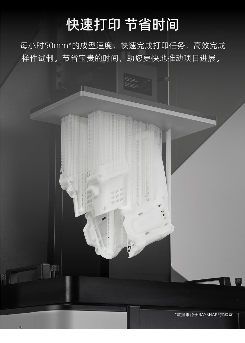 RAYSHAPEShape1+3D打印機采用的數字光處理技術,能夠在同等打印質量下,實現比傳統SLA3D打印機更快的打印速度。DLP3D打印機的投影光源可以同時照射整個打印層,而不像SLA3D打印機那樣單點逐行掃描,這樣就能夠快速地固化大面積的光敏樹脂,從而大幅提高打印速度。