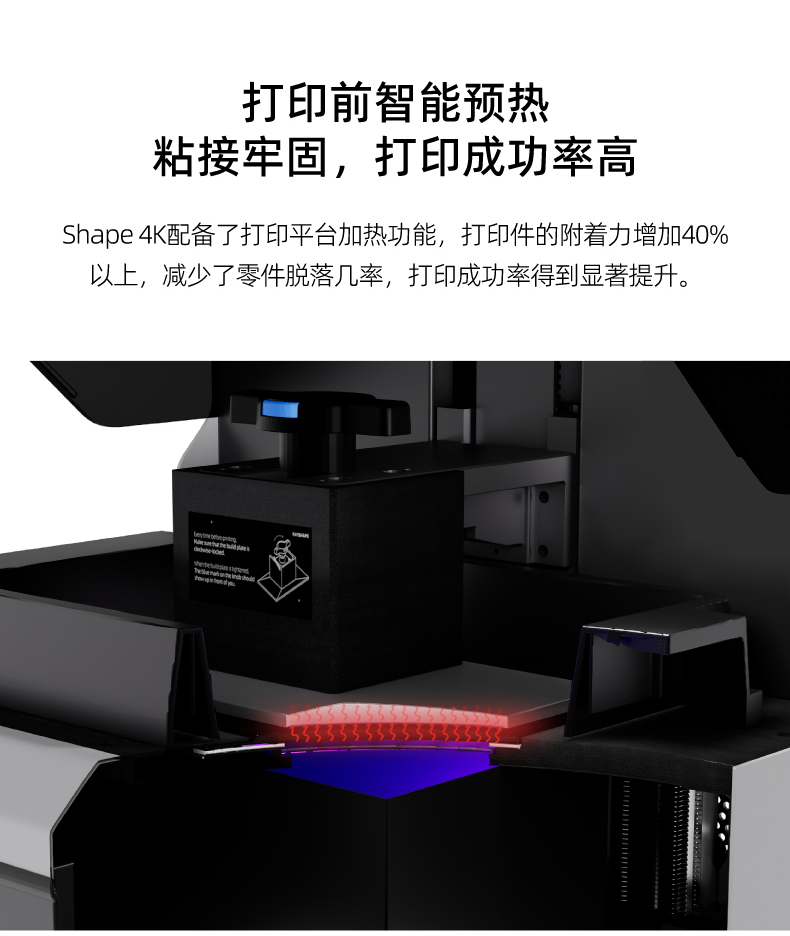 shape 4K配備了打印平臺加熱功能,打印件的附著力增加40%以上,減少了零件脫落幾率,打印成功率得到顯著提升。