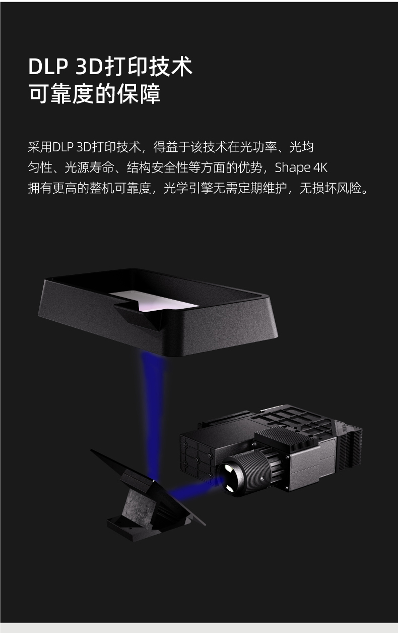 shape 4K采用DLP 3D打印技術,得益于該技術在光功率、光均勻性、光源壽命、結構安全性等方面的優勢,shape 4K擁有更高的整機可靠度,光學引擎無需定期維護,無損壞風險。
