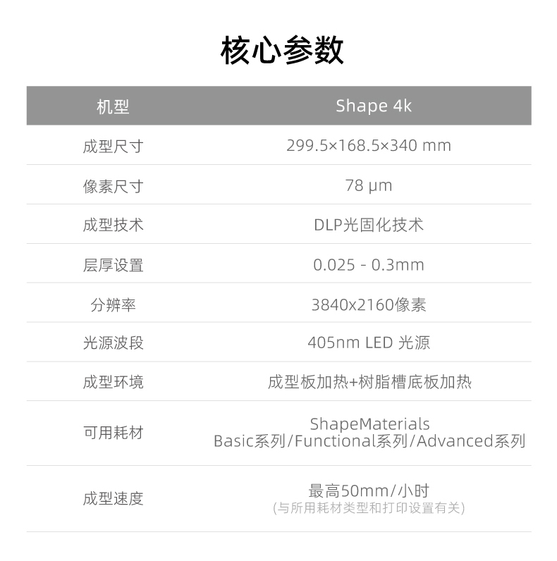 Shape 4K大幅面DLP3D打印機效率與性能雙突破,先進企業的省心之選,更大尺寸,更高精度,405mm光源4k光機帶來高達0.075mm的超高精度,更支持光斑自定。最高打印速度可達50mm/小時,5倍高速于其他同類型產品。